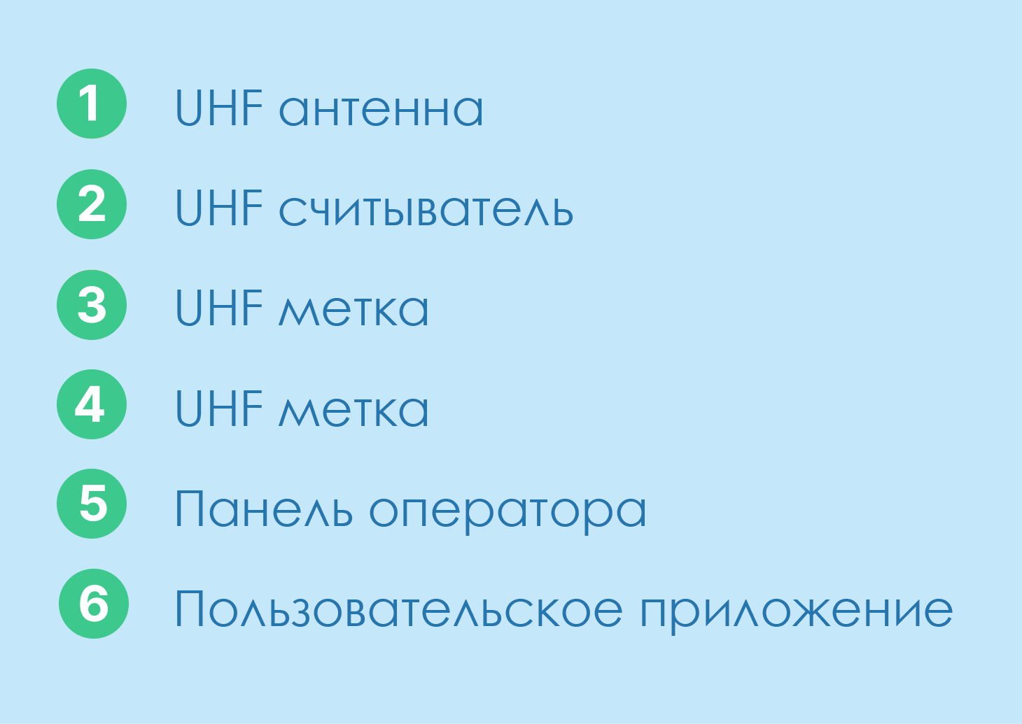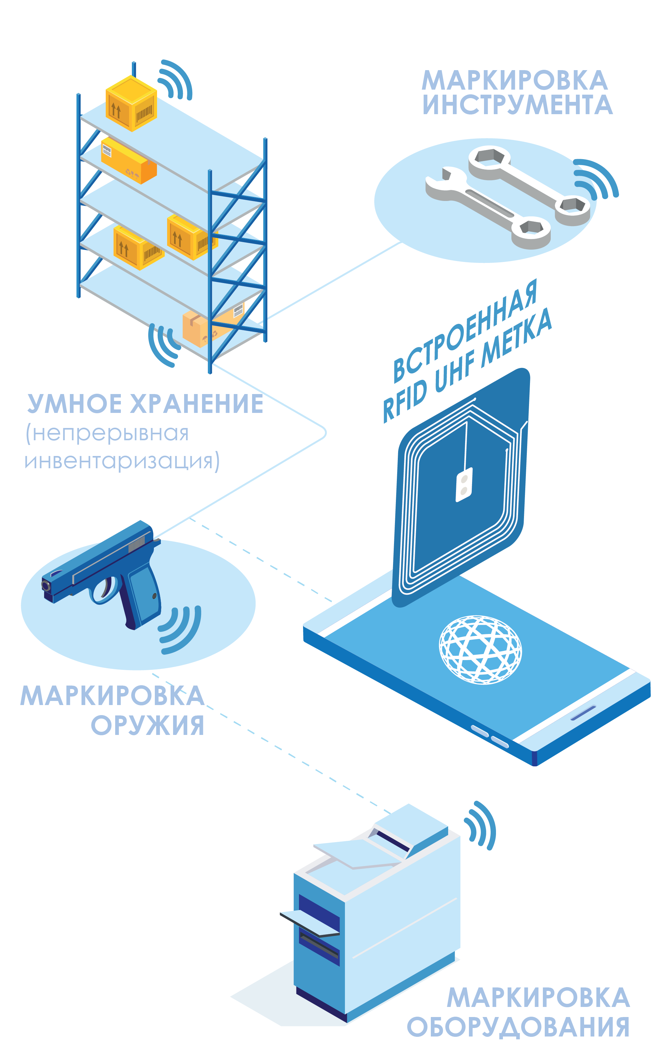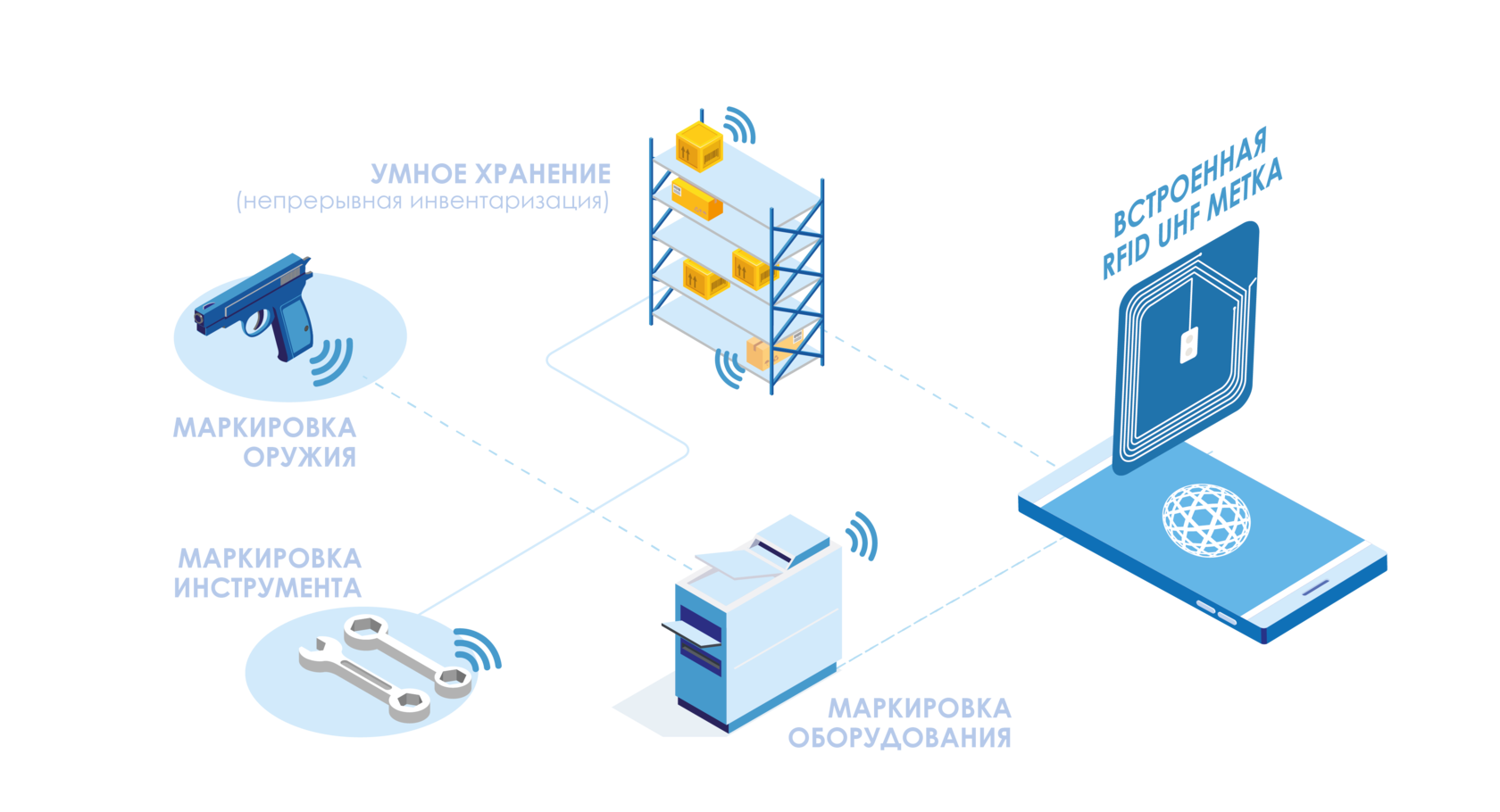 • Установка считывателей на места хранения • Установка радиометок на объекты • Настройка правил доступа к объектам • Автоматическая фиксация расхода и прихода